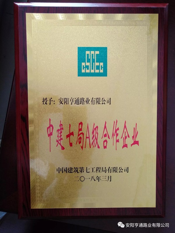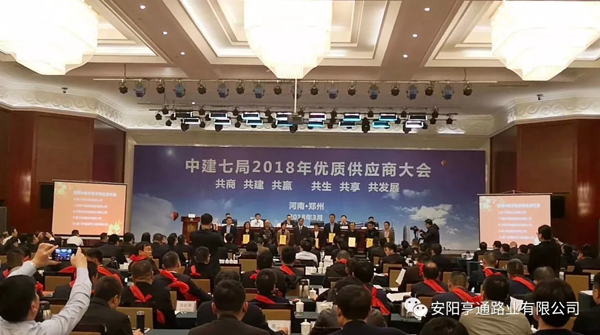 在2018年3月8日中建七局交通公司“2018年度生產(chǎn)推進(jìn)會(huì)暨2017年度供應(yīng)商大會(huì)”上,安陽(yáng)亨通路業(yè)有限公司又獲得了中建七局交通公司頒發(fā)的“優(yōu) 秀合作企業(yè)”的榮譽(yù)稱號(hào)。